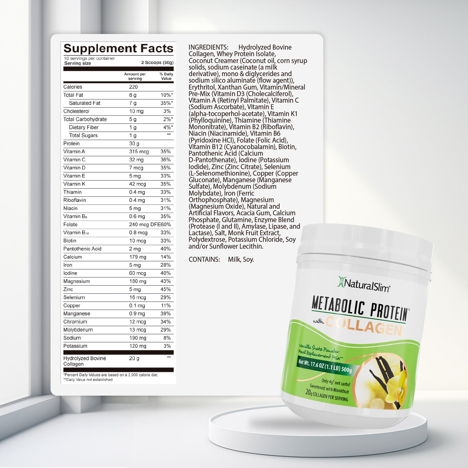 METABOLIC PROTEIN COLLAGEN™ is our whey protein shake, with 20 grams of Collagen per serving and naturally sweetened with Monkfruit. The human body has proteins, fats and minerals in its bones but approximately one third of the human body is composed of a protein called collagen. The body is elastic and collagen is what makes the body elastic.